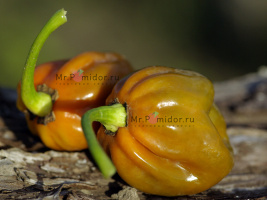 Стабильный кросс Scotch Bonnet Faria и 7 Pot Douglah. Куст компактный, с крепким центральным стеблем и боковым ветвлением, высотой до 70 см. Плоды ребристые, горчичного цвета в биологической зрелости. Мякоть стручка сочная, с тонким ароматом тропических фруктов и остротой примерно 500 000- 700 000 shu.