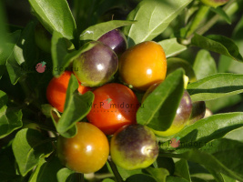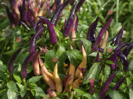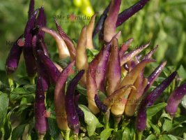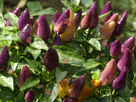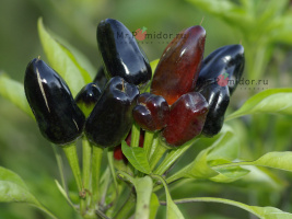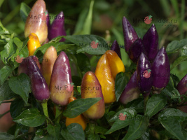 Один из самых ярких и декоративных сортов острого перца. Нарядный, хорошо облиственный кустик высотой до 30 см, компактный, с крепким центральным стеблем. Лист темный. Стручки конусовидные, довольно крупные для подобных сортов, среднесочные, перецветают от фиолетового до желто-оранжевого в биологической зрелости. Острота нерезкая, приятная, примерно 5 000 SHU. Вкус перечный, сладковатый, без горечи. Очень продуктивный и красивый.