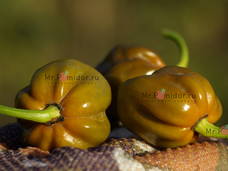 Стабильный кросс Scotch Bonnet Faria и 7 Pot Douglah. Куст компактный, с крепким центральным стеблем и боковым ветвлением, высотой до 70 см. Плоды ребристые, горчичного цвета в биологической зрелости. Мякоть стручка сочная, с тонким ароматом тропических фруктов и остротой примерно 500 000 - 700 000 shu.