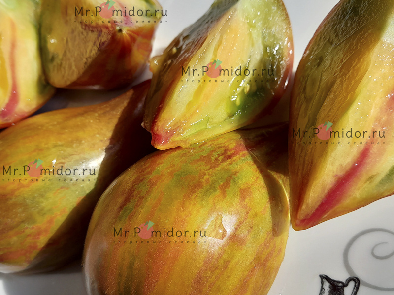 Молодой сорт от Софии Саковой, стадия развития F7. Индет, высокорослый, среднего срока созревания. Плоды сердцевидные, снаружи вишнево-коричневые с оливковыми полосками и штрихами, на разрезе горчично-малиновые биколоры, массой 200-350 г. Мякоть сочная, сладкая, очень вкусная.