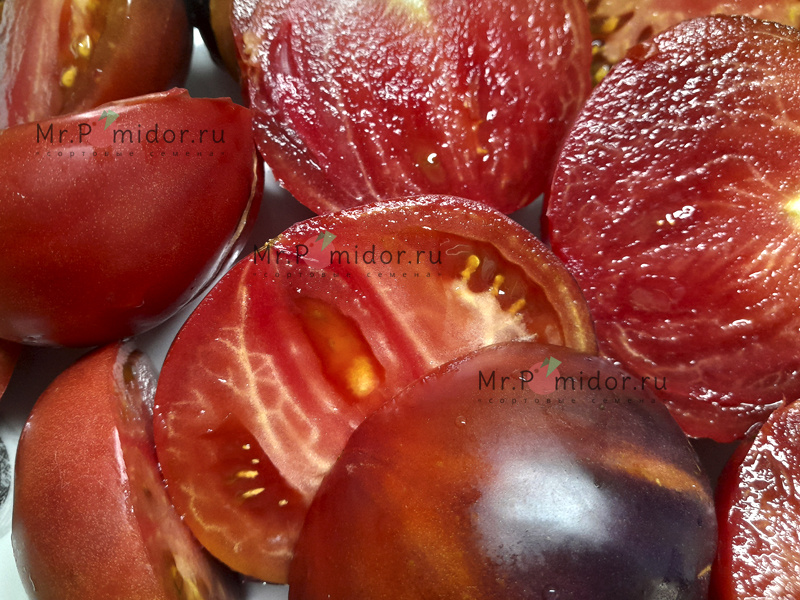 Индет, высокорослый, среднеспелый. Плоды тёмно-вишнёвые с плотным антоцианом, крупные, вес отдельных плодов до 400-500 граммов, округло-сердцевидные. Мякоть вишнёвого цвета, плотная, с очень малым количеством семян. Вкус терпкий, насыщенный, сладкий. Очень урожайный и вкусный!