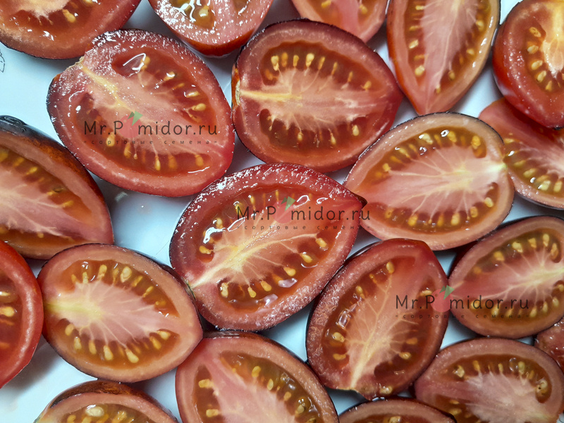 Индетерминантный, среднеранний. Среднеоблиственный стройный куст, высотой 1,3-1,5 м. Плоды сливовидные, с глянцевой антоциановой кожицей, одномерные в кистях, с заострённой верхушкой, массой до 100 г. Мякоть красная, сладкая, с пряным ароматом и фруктовой ноткой.