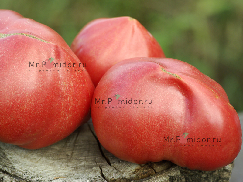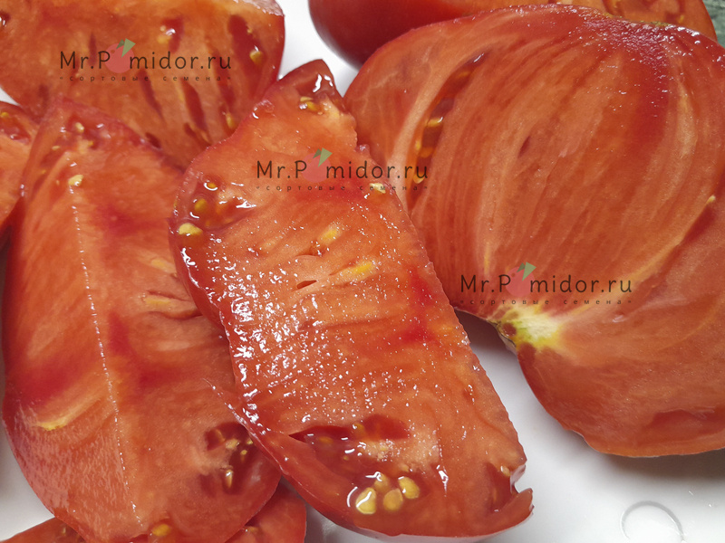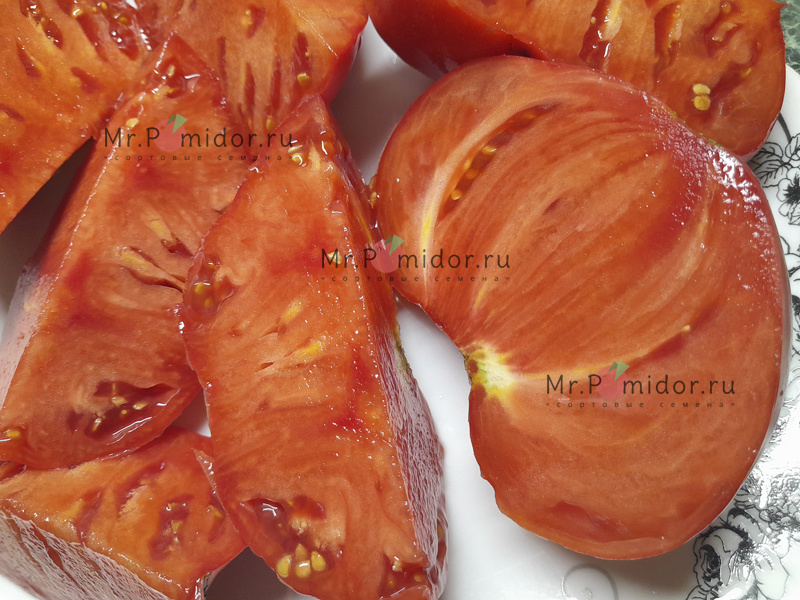 Индет, высокорослый, среднего срока созревания. Плоды сердцевидные, малинового цвета, массой от 300 г и более. Мякоть плотная, сладкая и ароматная, с небольшим количеством семян, очень вкусная.