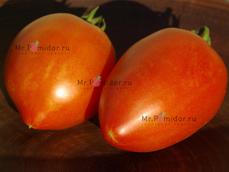 Высокорослый урожайный сорт среднего срока созревания. Плоды в форме крупной сливы, массой в среднем 180-250 г, универсального назначения, насыщенного красного цвета, красивые. Очень мясистые, сочные, имеют приятный томатный аромат и отличный вкус. Для свежего потребления, консервирования и переработки на томатопродукты.