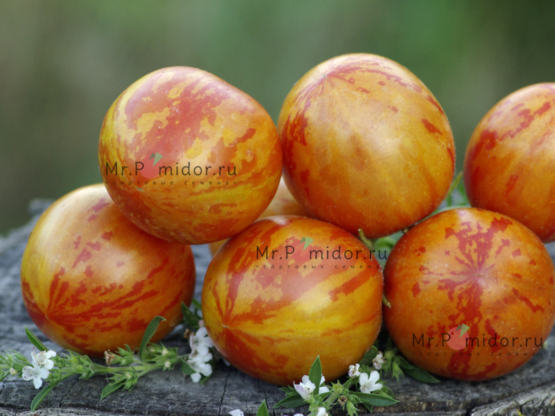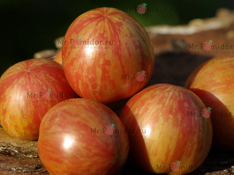 Детерминантный, высота до 50 см в ОГ. Куст крепкий, штамбового типа, с очень необычными морщинистыми листьями светло-зелёного цвета. Сорт среднеспелый, урожайный, не болеет. Декоративен, идеален для выращивания в кашпо или контейнерах от 5-8 л. Плоды округло-сливовидные с маленьким носиком, красного цвета с золотисто-желтыми полосками, весом 30-50 граммов. Помидорки сочные, мясистые, с тонкой кожицей, вкус отличный–сладкий и приятный. Лежкие, не склонные к растрескиванию. Сорт родом из Нидерландов, внесен в Ежегодник Seed Savers Yearbook за 2006 год бельгийским коллекционером Люком Фишо.