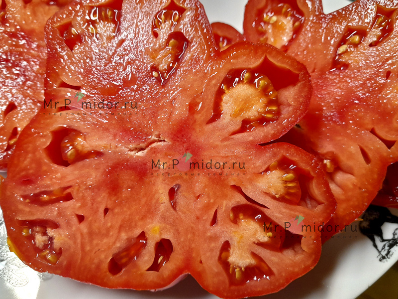 Индет, высокорослый, среднеспелый. Помидоры темно-красного цвета, переменной формы, с выраженной ребристостью, до 500 граммов и более. Мясистые, с очень малым количеством сока и небольшими пустотами в семенных камерах. Сбалансированный насыщенный вкус с преобладанием сладости. Для салатов, бутербродов, нарезки и густых соусов. Сорт из теплиц Ассоциации Lestrem Reagir в Северной Франции.