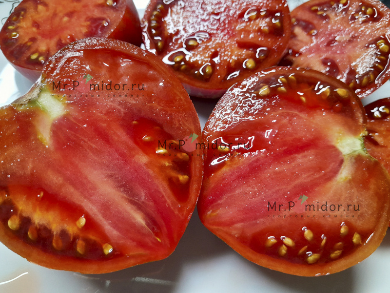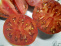 Детерминантный, штамбовый, высотой до 1 м, среднеспелый. Лист простой, крупный, морщинистый. Плоды крупные, сердцевидные , бордово-пурпурные с оливковыми полосками, массой 200-300 г. Мякоть темно-вишневая, маслянистая, мягкий пряно-сладкий вкус. Урожайный и очень красивый сорт томата.