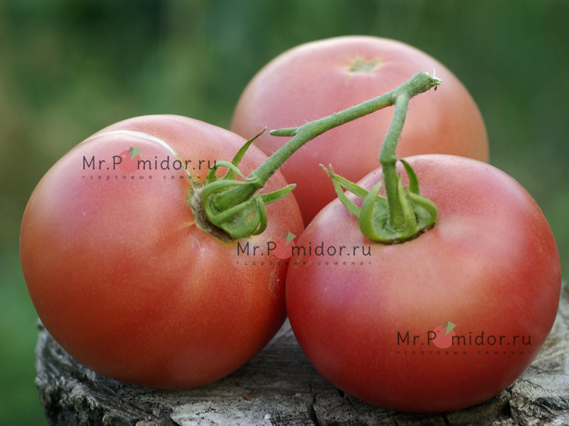 Старинный сорт из России. Индет, высокорослый, среднего срока созревания. Плоды округлые, одномерные в кистях, розового цвета, гладкие, с прочной матово-перламутровой кожицей, массой 200-300 г. Плоды плотные, с сахаристой мякотью, транспортабельные, вкусные.