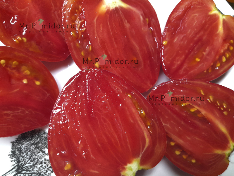 Индет, высокорослый, среднего срока созревания. Стройный куст с регулярным листом. Плоды сердцевидные, малинового цвета, массой от 300 г и более. Мякоть маслянистая, ароматная и очень вкусная.