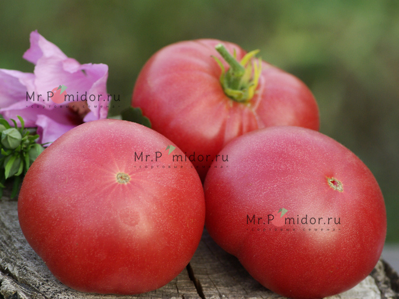 Высокорослый, очень продуктивный, индетерминантный сорт. Плоды плоскоокруглые, аккуратные, идеальной формы, красивого пурпурно-малинового цвета, одномерные в кистях, с гладкой кожицей, массой в среднем 250-300 г. Мякоть сочная и мясистая, вкус классический, насыщенный.