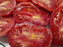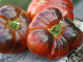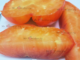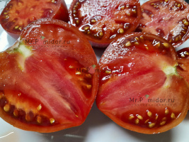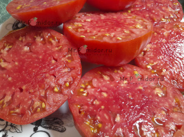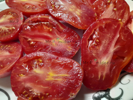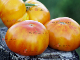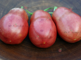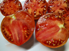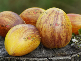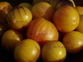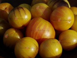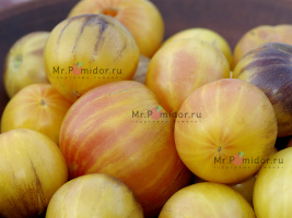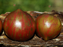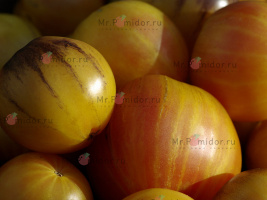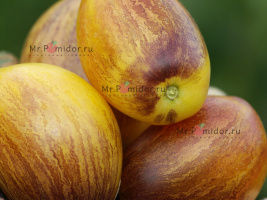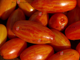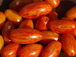 Есть в наличии Индетерминантный, высокорослый , среднеспелый. Формировать лучше в 2-3 стебля. Форма плодов удлиненная, «сосулька с носиком», гладкая. Помидорки красные с тигровыми, желтыми полосками, массой 30-50 г. В разрезе красно-розовые. Томаты очень сладкие, сочные, с ярким томатным ароматом. Долго не перезревают, не трескаются, лежкие и транспортабельные. Хорош для свежих салатов, нарезки, гарниров. Отличный вариант для консервирования и приготовления ароматных, насыщенных соусов, для сушки и вяления. Устойчив к основным болезням томата. Плодоношение до заморозков.