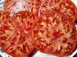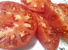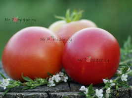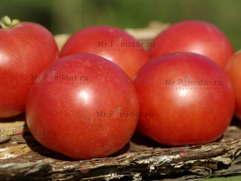 Среднерослый, со светлым картофельным листом, среднего срока созревания. Плодоношение длительное, устойчив к капризам погоды. Плоды плоскоокруглой формы, ярко-розового цвета,  очень мясистые и сочные, массой 200-350 г.