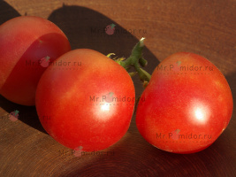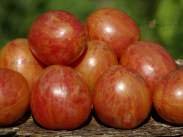 Детерминантный, среднеранний, штамбовый, с простым морщинистым листом, высотой до 70 см. Плоды сливовидные, розово-малиновые в золотистую полоску, в кистях по 5-6 плодов, массой 50-80 г. Плотные, лёжкие, мясистые, с плотной кожицей. Сладкие, вкусные. Для свежего потребления, консервирования, вяления и заморозки.