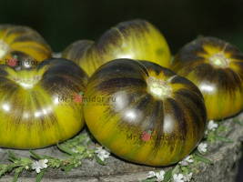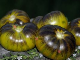 Детерминантный, среднего срока созревания, лист простой морщинистый.  Плоды плоскоокруглые, оливково-изумрудные  с антоциановыми полосками и шрихами, массой до 300 г. Мякоть очень сочная, мармеладной консистенции,  с ярким вкусом и ароматом, сладкая. Очень красивый и урожайный сорт.