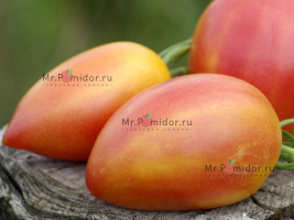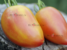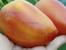 Индет. Высокорослый, среднеспелый. Куст стройный, нуждается в хорошей опоре и подвязке. Плоды перцевидные, массой 180-250 г, в кистях по 5-7 штук. Оранжево-желтые, с румянцем и красивой оранжево-розовой мякотью. Сочная мякоть мармеладной консистенции, вкусная, сладкая. Выращиваем 7 лет, стабилен.